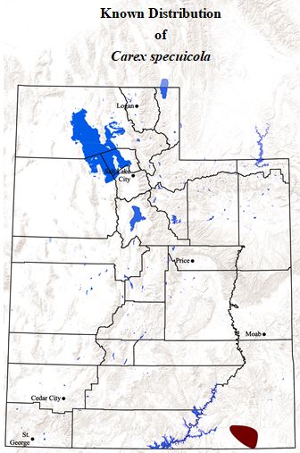 Carex specuicola relies heavily on local hydrology systems that create the lush, vertical seeps and springs known as hanging gardens where it grows.ongoing drought and development that limits water-flow to populations along with grazing are threats to this species.