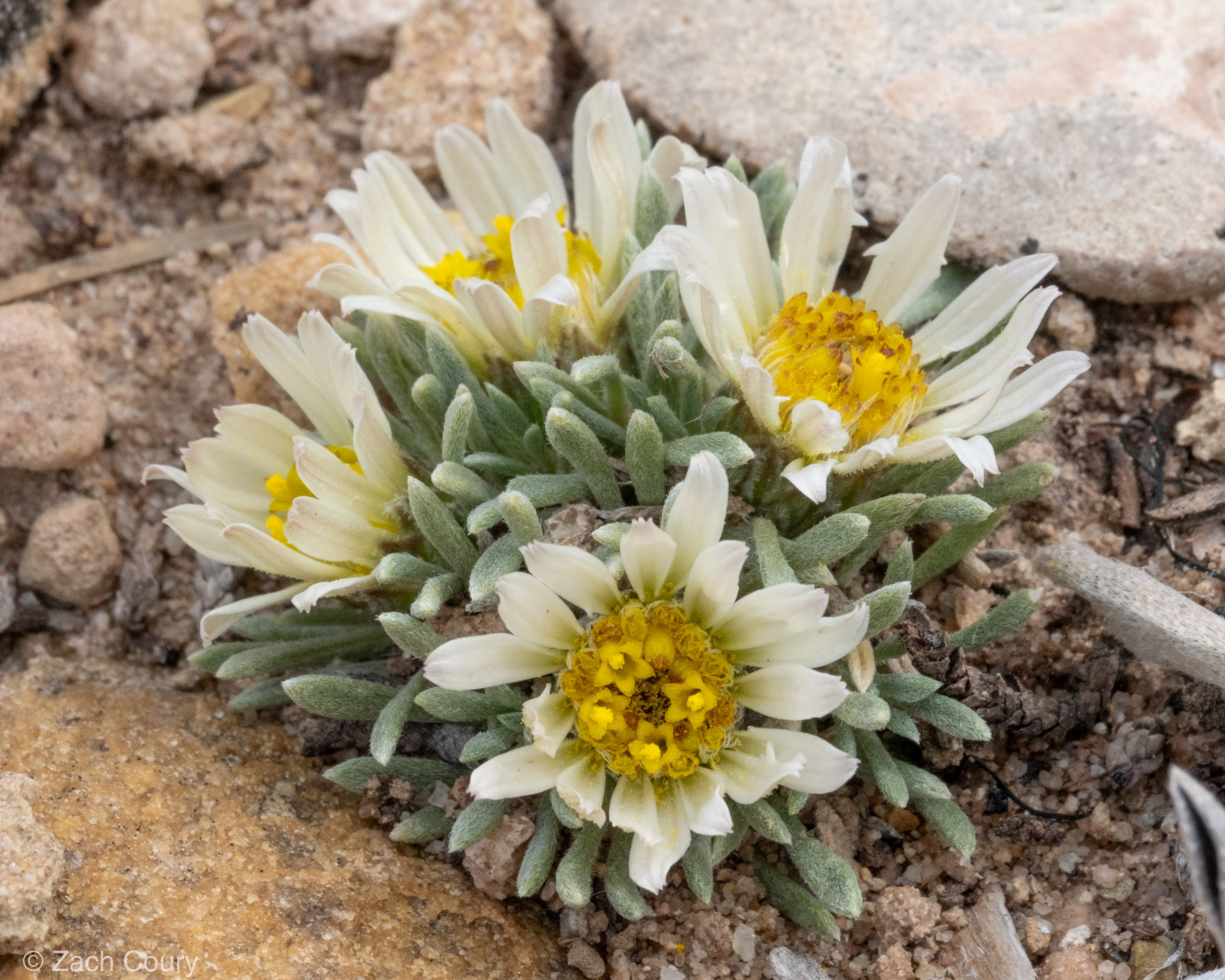 Townsendia mensana is often easy to separate from other species when in its range and habitat. Those searching should look for narrow, linear leaves that form a dense cushion, and small flower-heads. Other possible Townsendia growing in arid, relatively low elevation locations in the Uinta Basin and Tavaputs Plateau regions include T. incana (silvery townsendia) and T. strigosa (strigose townsendia). T. strigosa is readily separable from T. mensana thanks to its more lax and spreading habit, as well as its reddish stems. In some cases, T. mensana can be challenging to discern from incana,especially when the species grow in the same area. This occurs when individuals have wider, larger, and rounder leaves than usual.