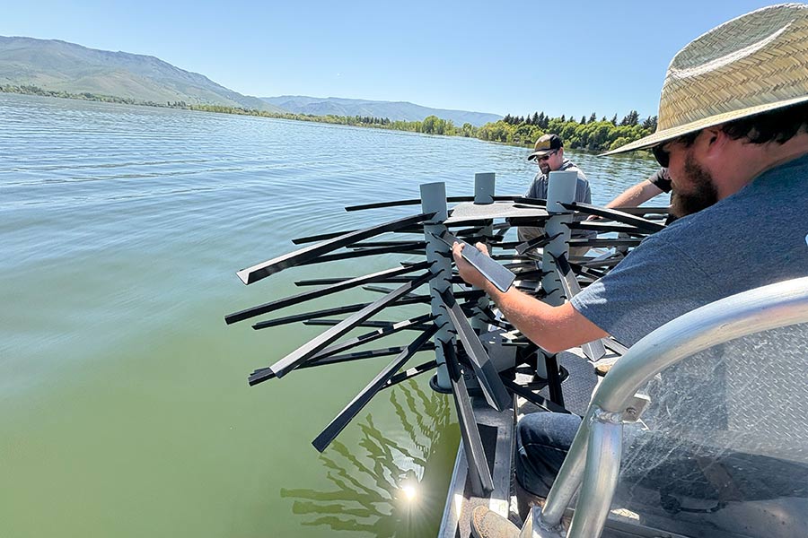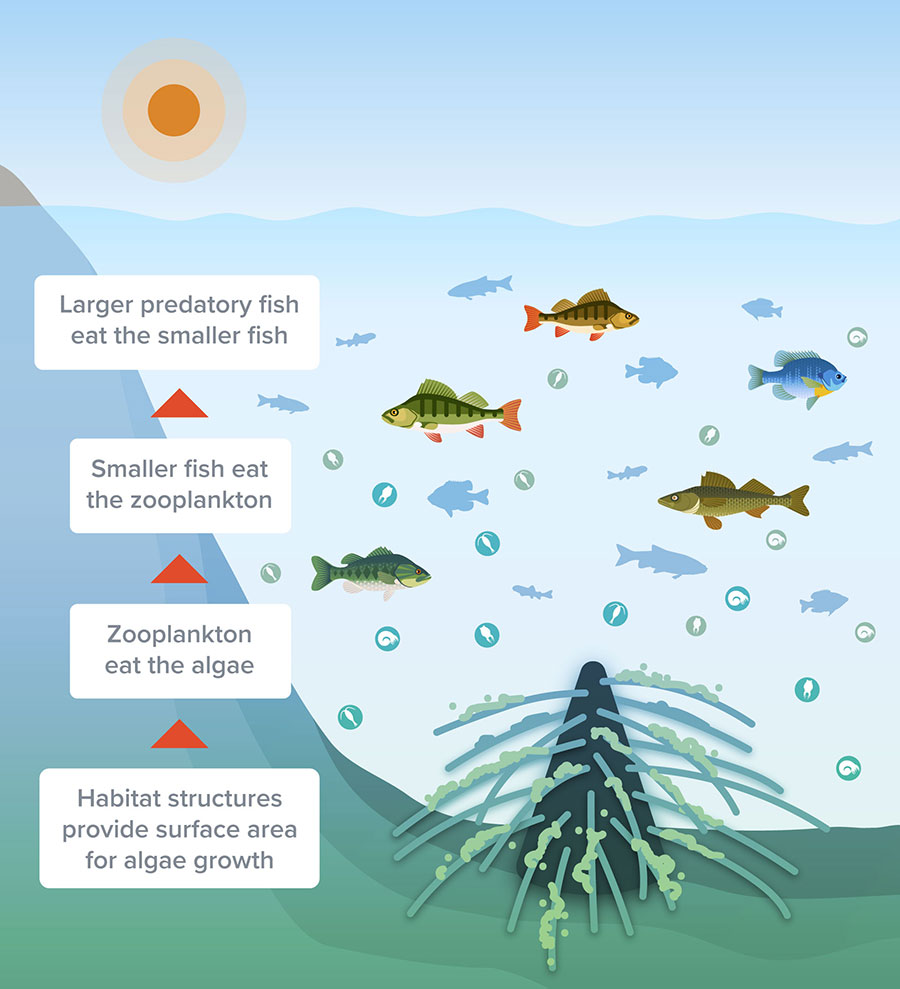 To encourage productivity in aging reservoirs, fisheries managers install fish habitat structures. These structures have natural or manufactured elements that provide a three-dimensional habitat for fish to safely hide from predators. They also provide surface area for algae to grow, in turn feeding zooplankton (the favored food of smaller fish) and on up the food chain.